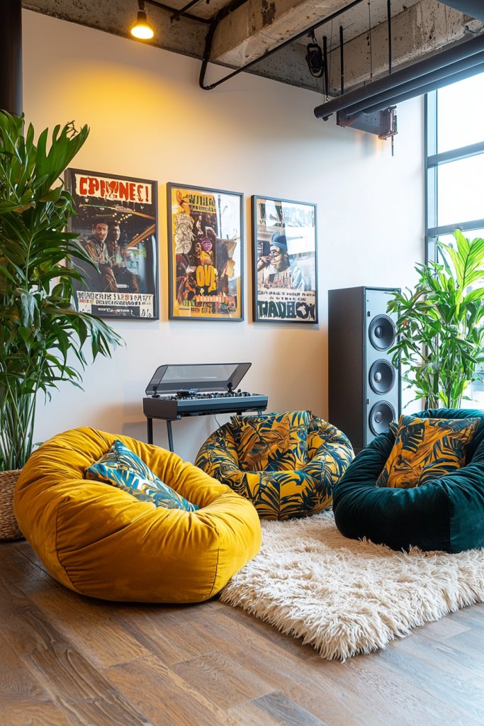 After soaking in the vibrant glow of neon accents, consider adding some playful comfort with bean bag chairs. These iconic pieces bring a sense of nostalgia and relaxation, perfect for lounging or casual gatherings.