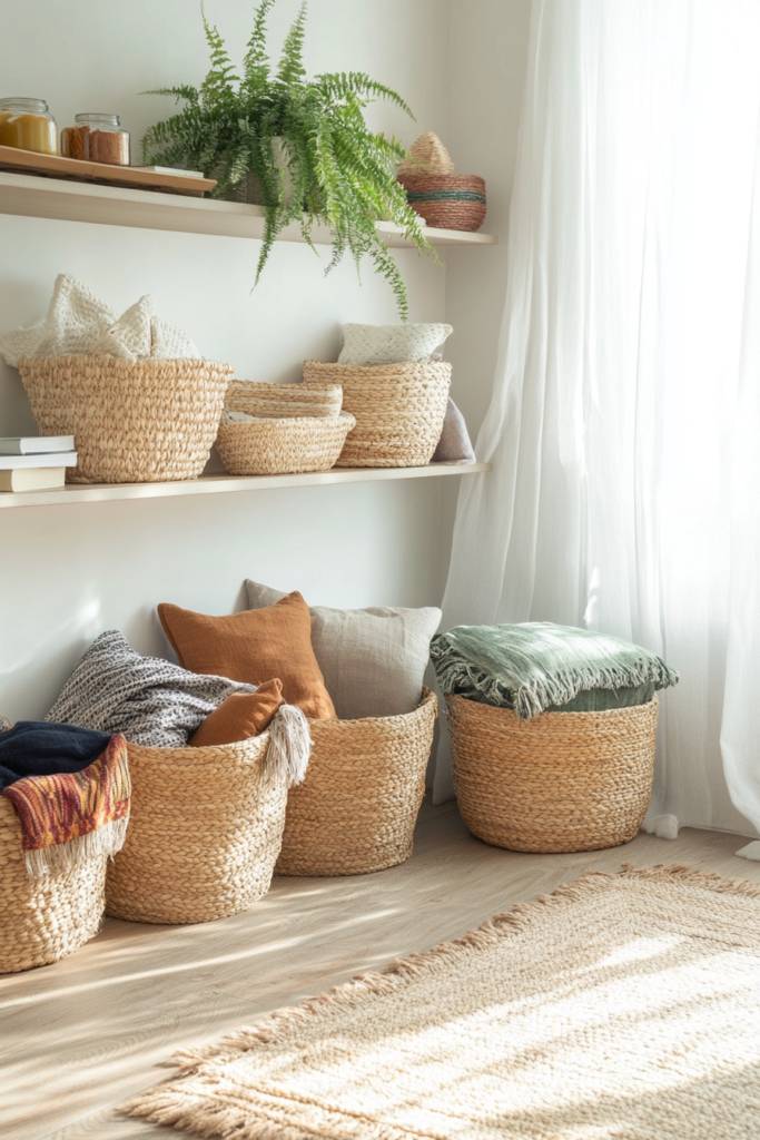 Consider placing a few decorative baskets on shelves or under tables; they not only serve as storage but also add texture and interest to your room. You could even label each basket to streamline finding what you need quickly.