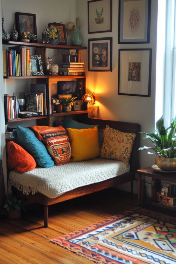 Next, consider adding a small side table for your favorite books and a warm cup of tea. If you’ve got a window, place your nook nearby to take advantage of natural light. For ambiance, string fairy lights or use a small lamp with a warm glow.