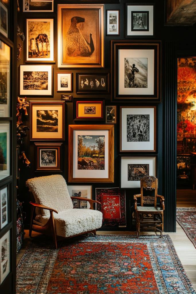 To lay it out, try arranging the frames on the floor first, experimenting with their placement until you find a configuration that feels balanced. Use painter’s tape to outline the arrangement on the wall, giving you a guide for hanging. Don’t forget to mix in some 3D elements, like small shelves for plants or knickknacks, to create depth. Finally, make certain to step back frequently to assess the overall look, adjusting as needed to guarantee your gallery wall reflects your unique style!