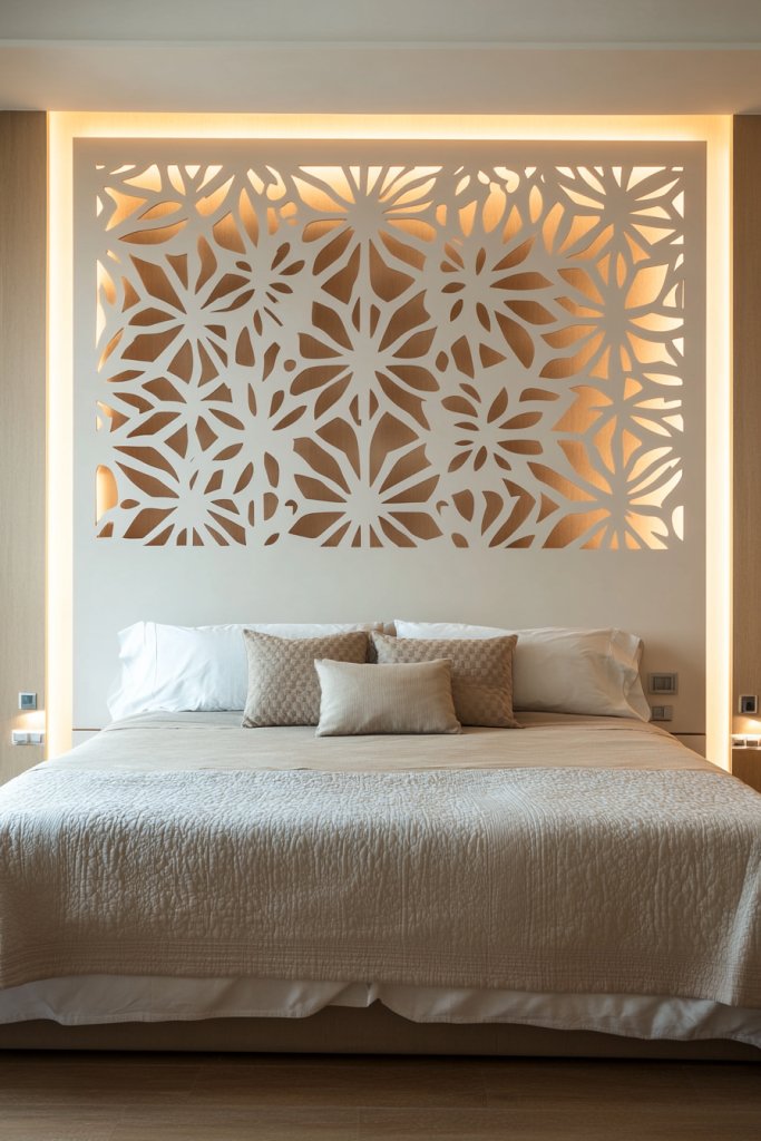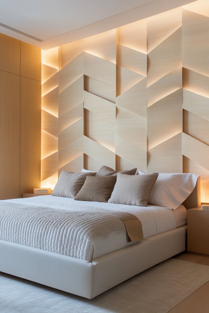 Highlight the pattern with directional lighting or LED strips. Add decorative molding to frame the pattern for a more refined look. Incorporate textured bedding or throws that echo the geometric lines. Seasonal color swaps can keep the aesthetic fresh.