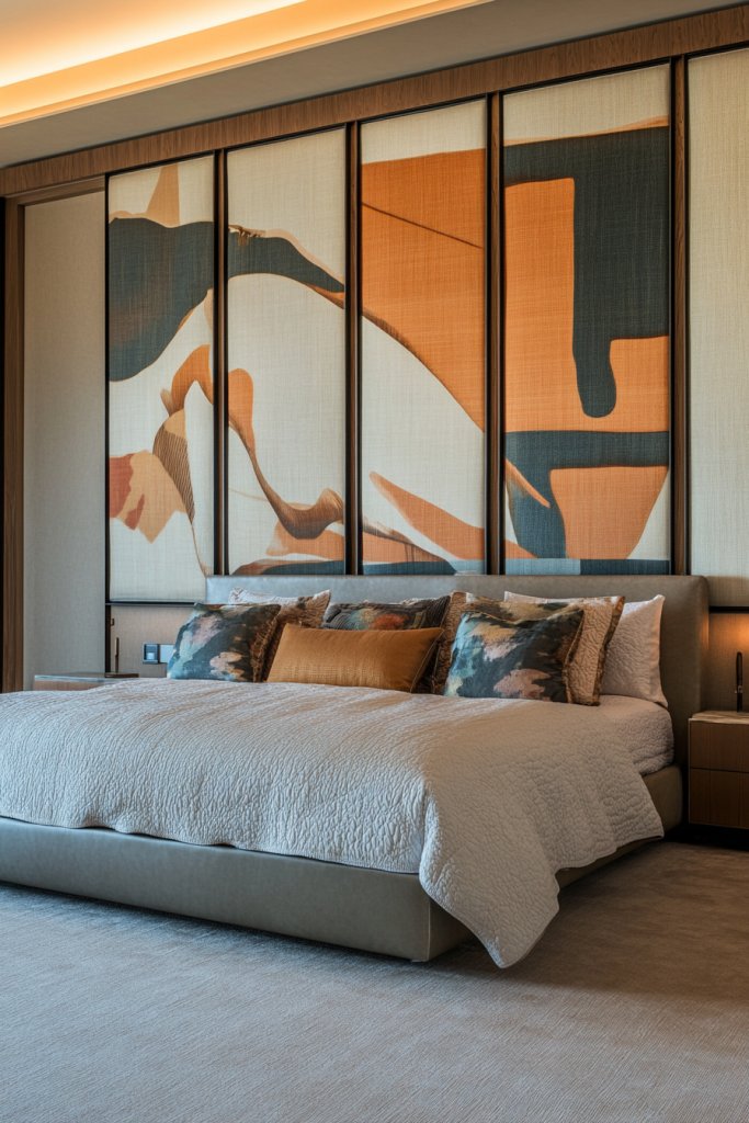 Fabric or canvas panels turn your walls into a creative canvas. They’re easy to customize and add a tactile, artistic layer to your bedroom. Ready to express yourself? This textured art-inspired approach makes your space truly unique.