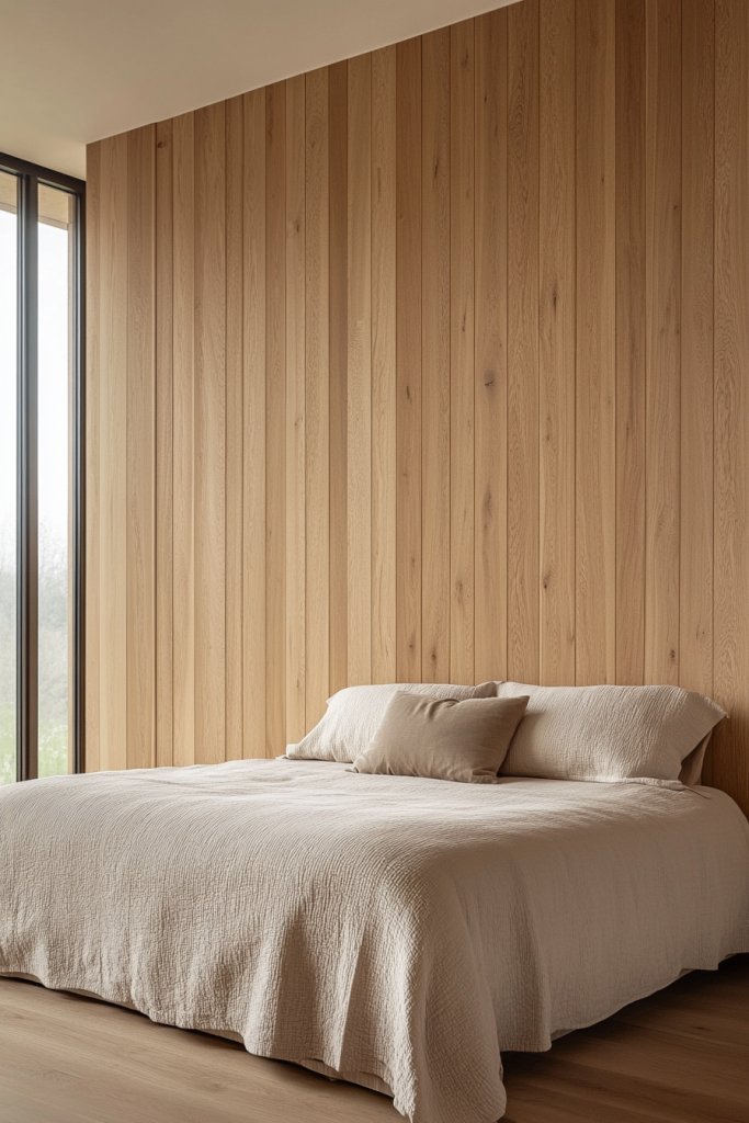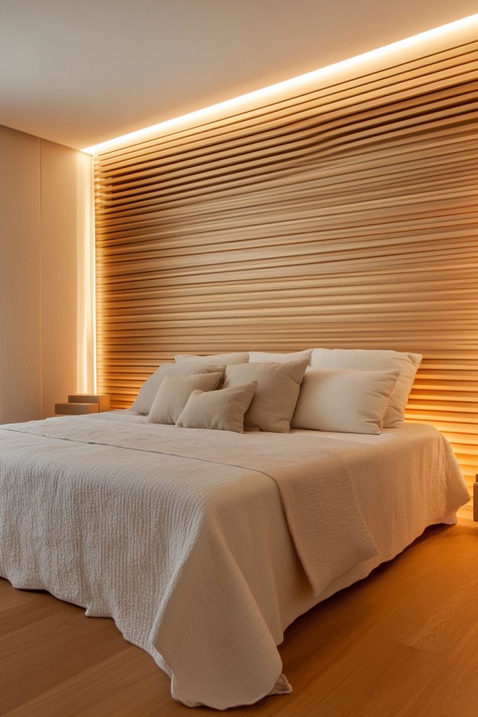 Picture evenly spaced, slim wooden slats running vertically or horizontally across your wall, in natural or stained finishes. The repetitive pattern creates a rhythmic, subtle texture that’s both modern and inviting. Shadows cast by the slats add depth, making the wall come alive with movement. The warm wood tones contrast beautifully with neutral bedding and clean-lined furniture.