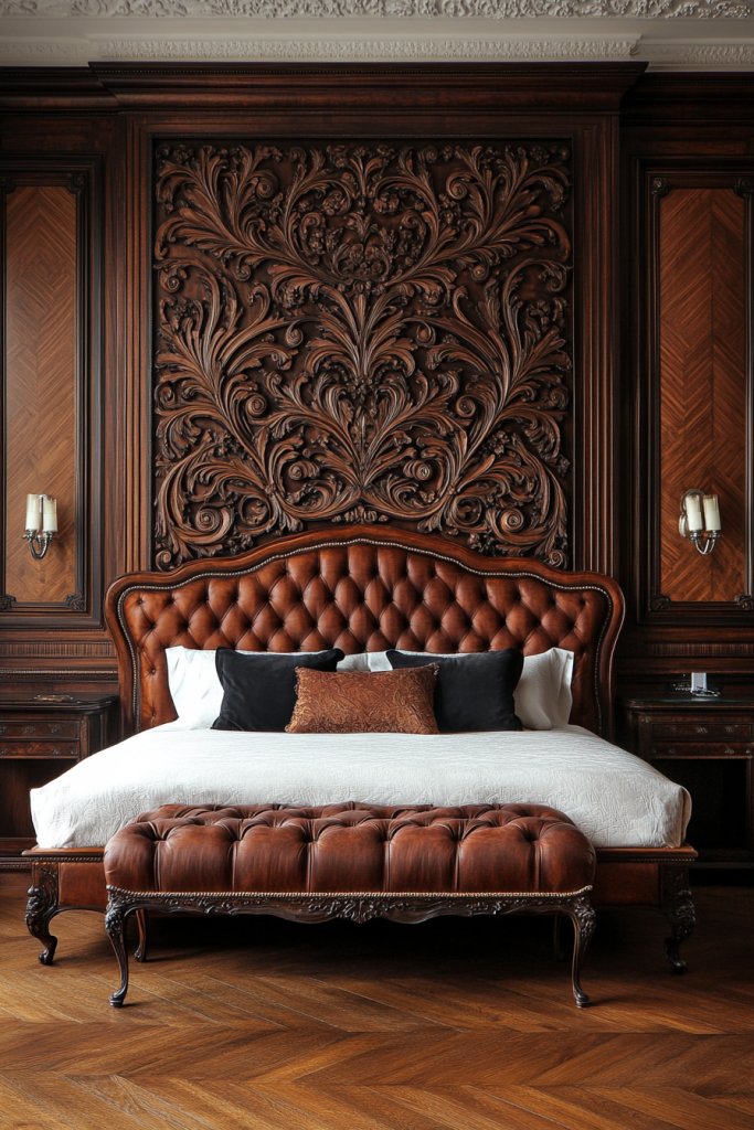 Longing for a touch of vintage elegance? Carved wood panels add intricate detail and timeless charm to your bedroom walls. They evoke craftsmanship and history, creating a warm, inviting atmosphere.
