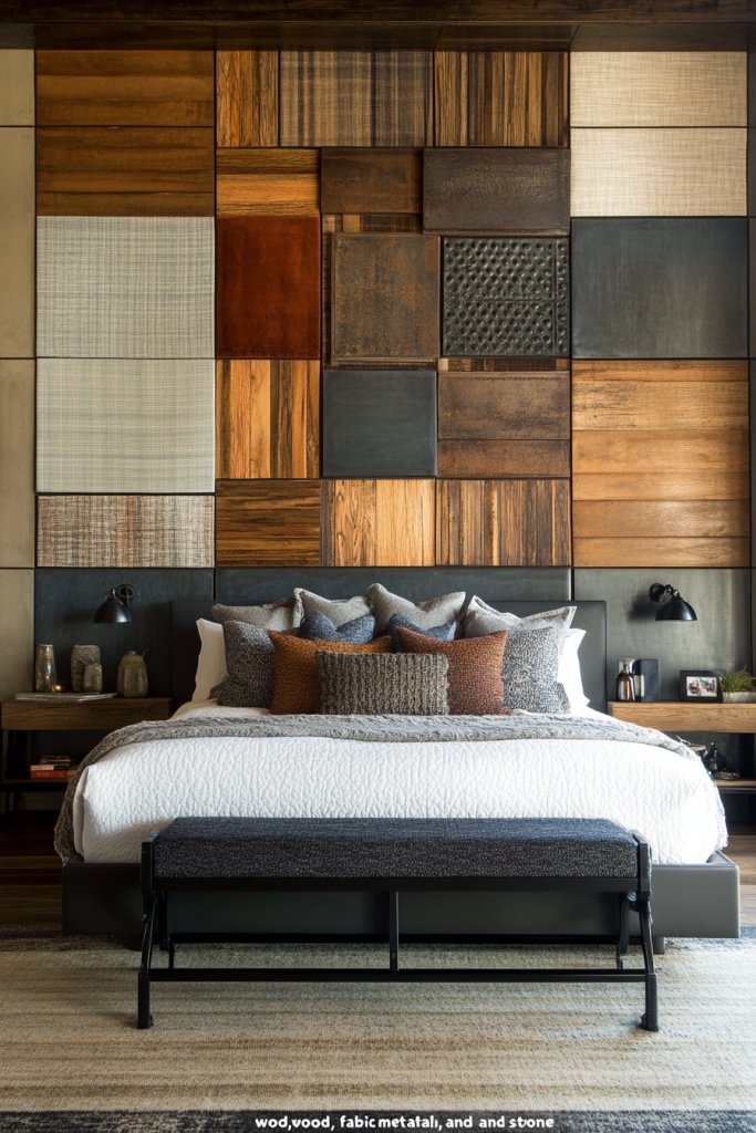 Want a truly unique, personalized wall? Mixing different materials—wood, fabric, metal, stone—creates a layered, textured masterpiece. It’s perfect for expressing your eclectic style and making your bedroom stand out.