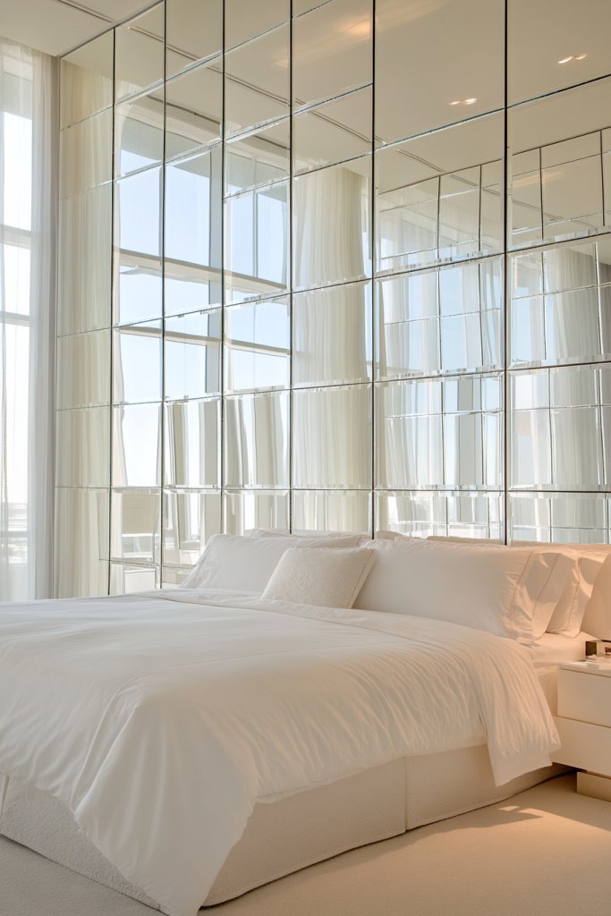 Want to make your bedroom feel more luxurious and brighter? Mirrored panels reflect light and visually expand your space. They add a touch of glamour that transforms a plain wall into a stunning focal point.