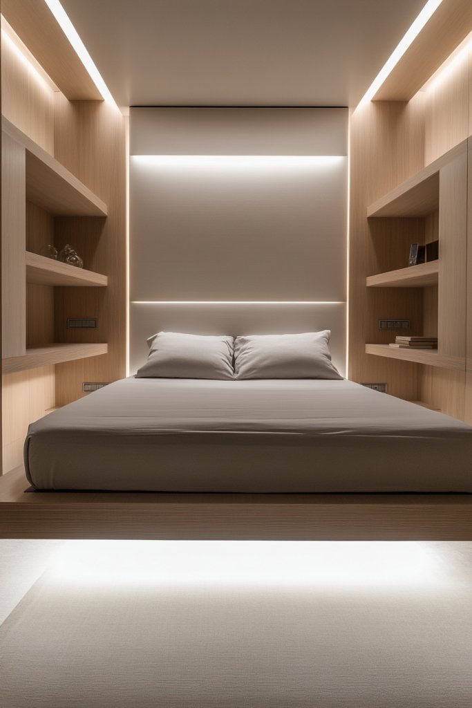 Picture a bed that appears to hover above the floor, with hidden supports or a minimalist frame. Wall-mounted shelves or cabinets run along the walls, providing storage without taking up floor space. The room feels open, airy, and uncluttered, with a focus on clean lines and functional design. Soft lighting from sconces or concealed fixtures enhances the streamlined look.