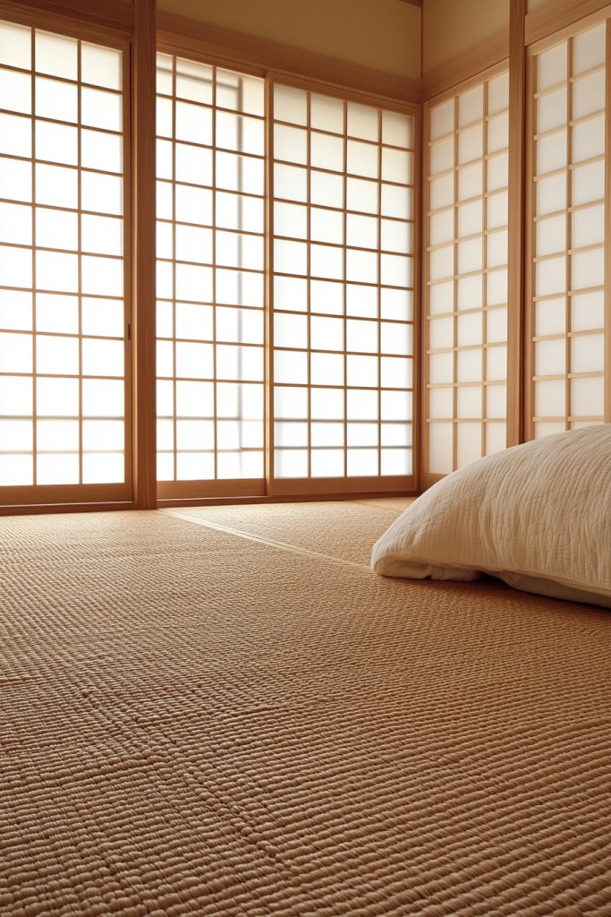Visualize a room with natural wood floors covered by tatami mats, creating a soft, textured foundation. Shoji screens with paper or fabric inserts partition the space subtly, adding a traditional Japanese touch. Minimalist furniture with clean lines and natural finishes complements the serene vibe. Soft lighting, perhaps from hidden fixtures or paper lanterns, adds to the peaceful atmosphere.