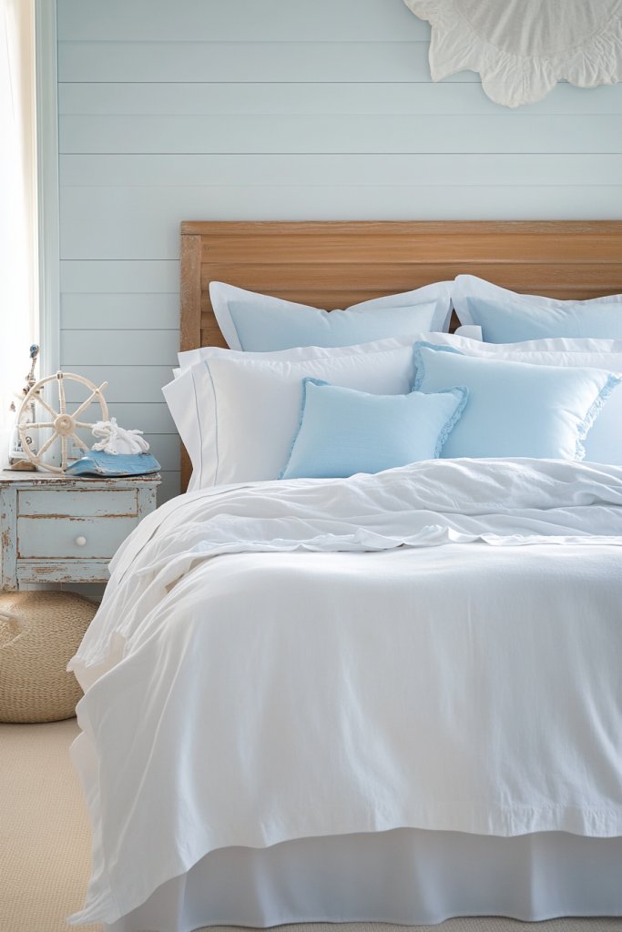 Incorporate different shades of blue—turquoise, navy, or pastel—alongside white for layered depth. Use woven baskets, rattan furniture, or linen textiles to reinforce the coastal theme. For winter, add cozy throws and heavier fabrics; in summer, keep everything light and breezy. Small bedrooms can use vertical stripes or subtle decor to avoid feeling overwhelmed, while large rooms can handle more layered accessories.