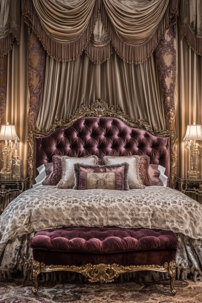 Picture a bed with a tufted velvet headboard, complemented by ornate metallic accents and elegant drapes. Soft, plush bedding in rich fabrics invites relaxation, while decorative pillows add layers of texture. Vintage mirrors, chandeliers, or ornate picture frames complete the look, casting a glamorous glow. The overall vibe is opulent yet inviting.