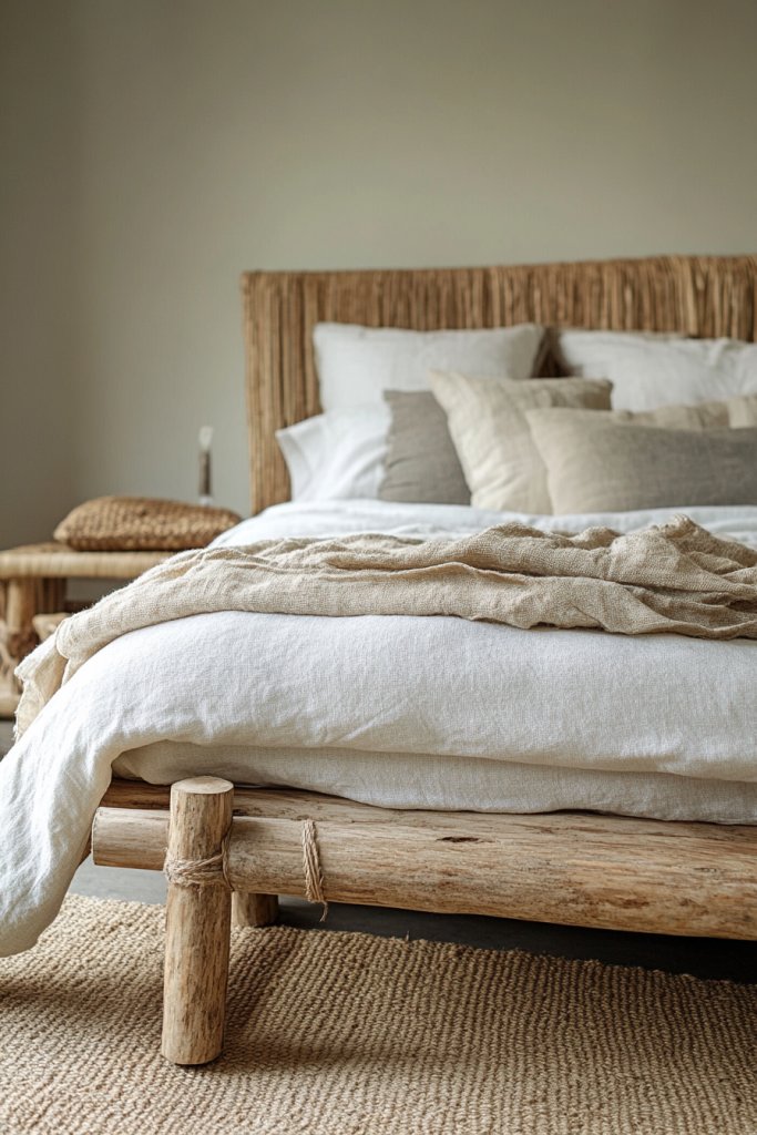 Imagine a bed frame made from weathered, reclaimed wood with visible grains and knots, paired with vintage nightstands. Soft, earthy textiles like linen or burlap add texture and warmth. The room is illuminated by warm, ambient lighting that highlights the natural imperfections of the wood. Decor accents like woven baskets or antique accessories add layers of character.
