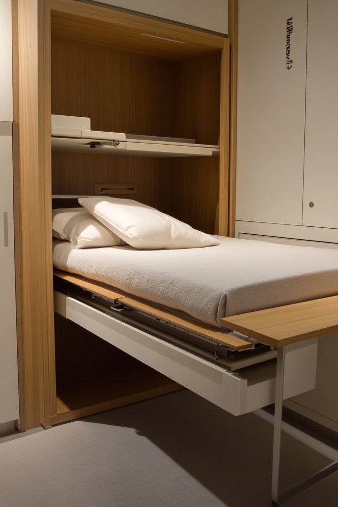 Picture a sleek bed that folds into the wall during the day, revealing a workspace or seating area. Multi-use desks that double as vanities, or beds with built-in storage, keep clutter at bay. The room transforms seamlessly from sleeping to working or relaxing, with hidden compartments and clever design features. The overall look is modern, uncluttered, and adaptable.