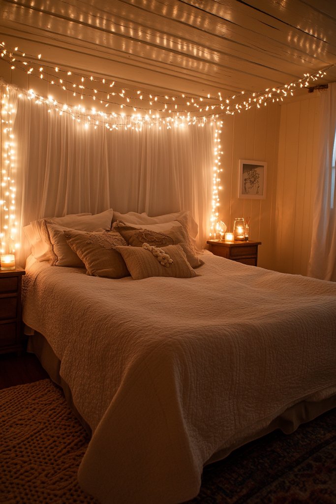 Use string lights in different configurations—cascading from ceiling to walls, or woven into headboard or drapes—for varied visual impact. Incorporate candles in decorative holders or lanterns for a cozy, rustic touch. For a modern look, opt for sleek, minimalistic lighting fixtures with adjustable brightness. Seasonal decor, like faux snowflake string lights or colored bulbs, can refresh the vibe.