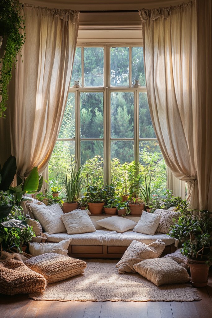 Picture a cozy corner by a window dressed with sheer curtains and a built-in bench or dedicated space. Plush floor cushions in botanical prints or textured fabrics invite you to sit and relax. Potted greenery and hanging planters surround the nook, bringing a fresh, natural vibe indoors. Soft natural light filters through, creating a peaceful, garden-like atmosphere.