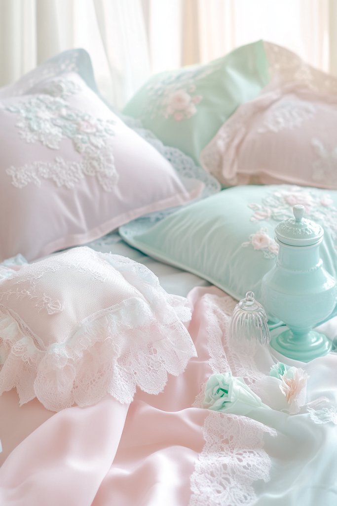 Visualize walls painted in blush pink or mint green, complemented by silky sheets and plush cushions in coordinating pastel shades. Light, airy curtains frame a window that lets in natural light, making the space glow. Subtle accents like delicate lace or embroidered textiles add a refined, feminine touch. A small, vintage-inspired vanity or bedside table enhances the delicate aesthetic.