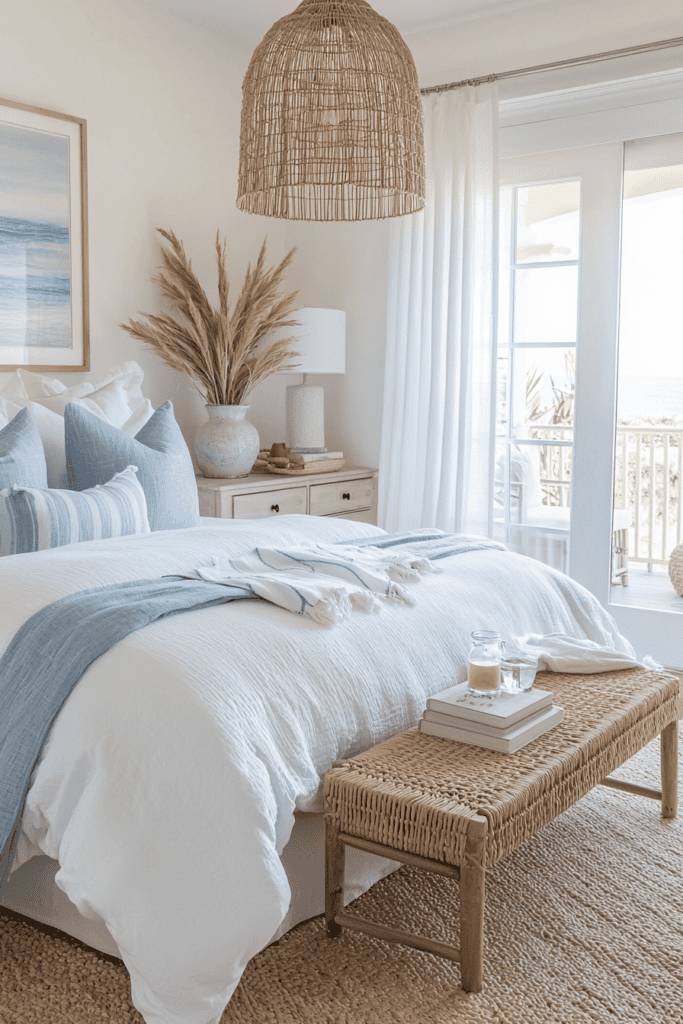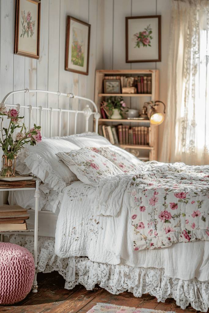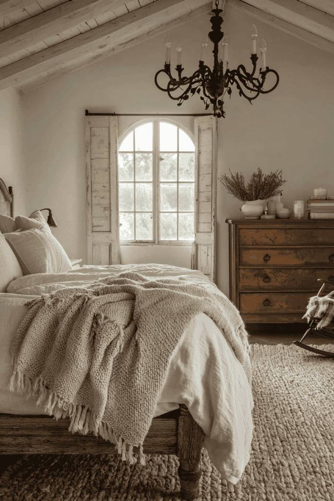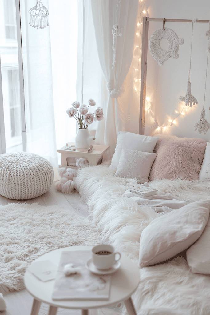 Texture plays a crucial role in preventing an all-white room from feeling cold or sterile. Plush bedding, tufted cushions, and subtle patterns on textiles add depth and warmth to the space. Vintage-inspired furniture, such as a French-style chaise lounge, further enhances the elegant aesthetic. Incorporating soft lighting, such as a chandelier or bedside sconces, adds a warm glow that enhances the refined feel. This Parisian decor style is perfect for those who love a blend of classic sophistication and cozy comfort.