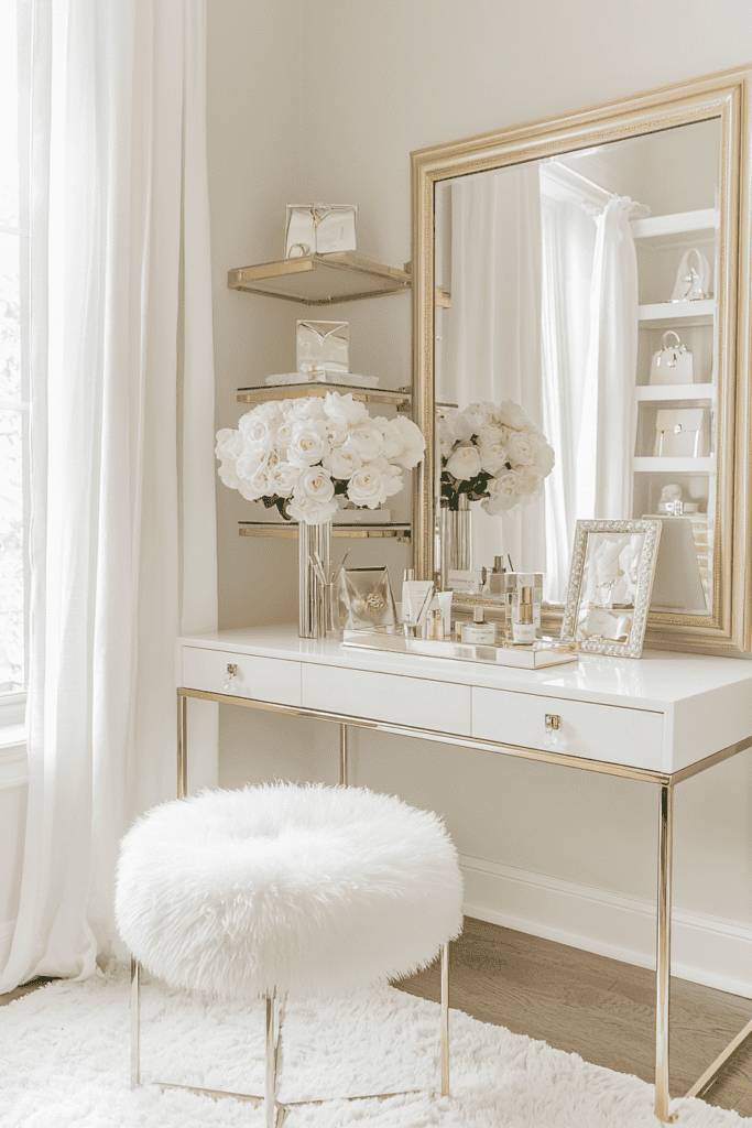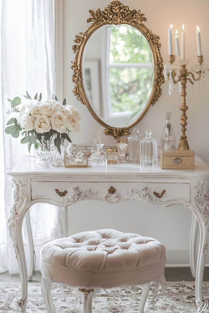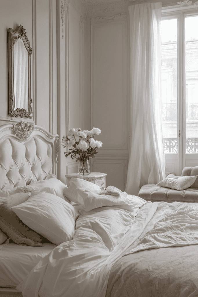 A Parisian-inspired room exudes elegance, sophistication, and timeless beauty through its all-white color palette. Ornate furniture, tufted headboards, and intricate wall moldings create a luxurious yet understated ambiance. Soft, billowy curtains allow natural light to flood the space, enhancing the dreamy, romantic aesthetic. Classic decor elements like antique-style mirrors and delicate floral arrangements elevate the room’s charm. The use of white as the primary color creates a bright and airy atmosphere, making the space feel both grand and inviting.