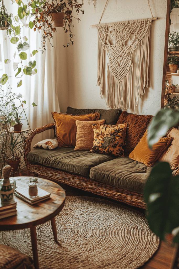Bohemian-inspired decor blends natural materials with eclectic patterns to create a cozy and artistic space. A macramé wall hanging serves as a stunning focal point, adding texture and a handmade charm to the room. Layering a mix of earth-toned cushions on a woven rattan sofa enhances the relaxed, lived-in feel. The combination of different textiles, from velvet to linen, creates a rich and inviting environment. A round jute rug anchors the space, adding warmth and a rustic touch that complements the boho aesthetic.