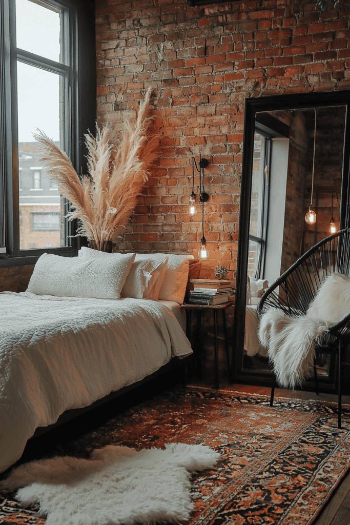 Personalized decor elements such as curated bookshelves and decorative trinkets make the space feel inviting. Richly textured pillows in burnt orange and deep brown introduce warmth and soften the industrial edges. A patterned Persian-style rug adds a touch of old-world charm, balancing the modernity of the decor. Large windows with industrial-style framing allow natural light to break through the darker tones, creating a balanced and dynamic aesthetic. This design approach is perfect for those who appreciate a mix of edgy urban vibes with cozy sophistication.