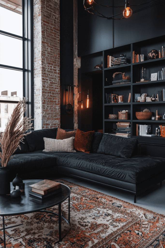 For a bold and modern aesthetic, an industrial loft-style room combines raw materials with dark, moody tones. Exposed brick walls, black metal shelving, and deep-colored furniture create a striking contrast that exudes urban sophistication. A sleek black sectional sofa anchors the space, offering both comfort and contemporary appeal. Vintage-inspired filament lighting fixtures add warmth, preventing the dark color scheme from feeling too harsh. The incorporation of leather, wood, and metal elements further enhances the rugged yet stylish ambiance.