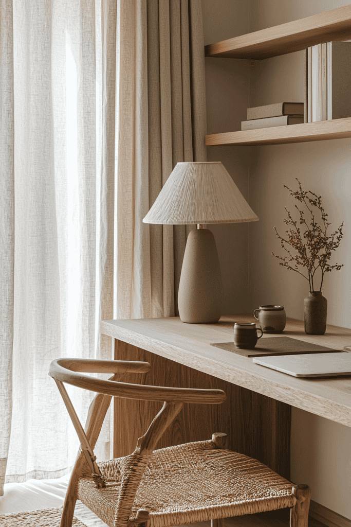 A thoughtfully designed workspace can enhance focus and productivity while maintaining a serene aesthetic. A minimalist desk setup featuring natural wood and neutral tones creates an environment free of distractions. A woven chair with organic textures adds warmth and complements the wooden elements. Floating shelves provide functional storage while maintaining a clean and uncluttered look. Simple decor elements like ceramic mugs, a soft-textured lamp, and a touch of greenery add personality without overwhelming the space.