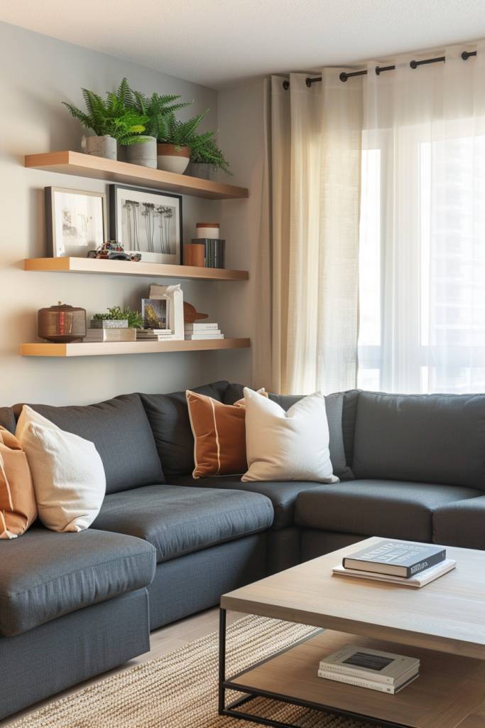 Integrating floating shelves can transform your living room into a stylish yet functional space, especially when you want to showcase decor without overwhelming the room. These sleek, minimalist shelves can serve as a canvas for your personal style. You can arrange books, plants, or cherished souvenirs that reflect your personality.