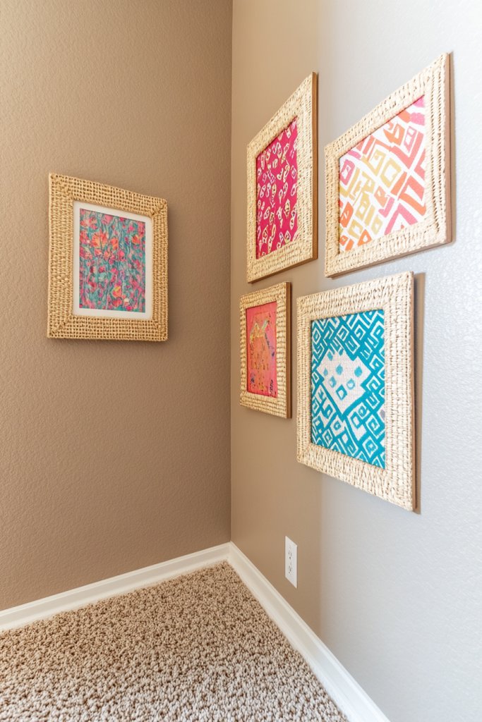 Imagine a wall filled with mismatched frames in boho patterns—think rattan, distressed wood, and metallic finishes. Inside, you feature your favorite prints, sketches, or even personal photographs, all arranged in a seemingly casual yet curated manner. The mix of patterns, textures, and colors creates visual interest that invites people to linger and explore. Soft textiles and layered decor add depth, making the whole display feel warm and inviting. It’s like a mini art exhibit right in your corner.