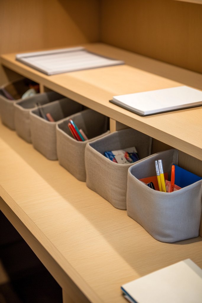 Envision a small corner featuring a multi-tiered desk—think a lower work surface with a raised shelf or compartments above. Store your paints, brushes, and sketchbooks in colorful pockets or bins attached underneath or on the sides. The space feels organized yet accessible, with everything within arm’s reach. Decorate with a small corkboard or magnetic strip nearby for quick reference or inspiration snippets. It’s a neat, efficient setup that feels inviting and inspiring.
