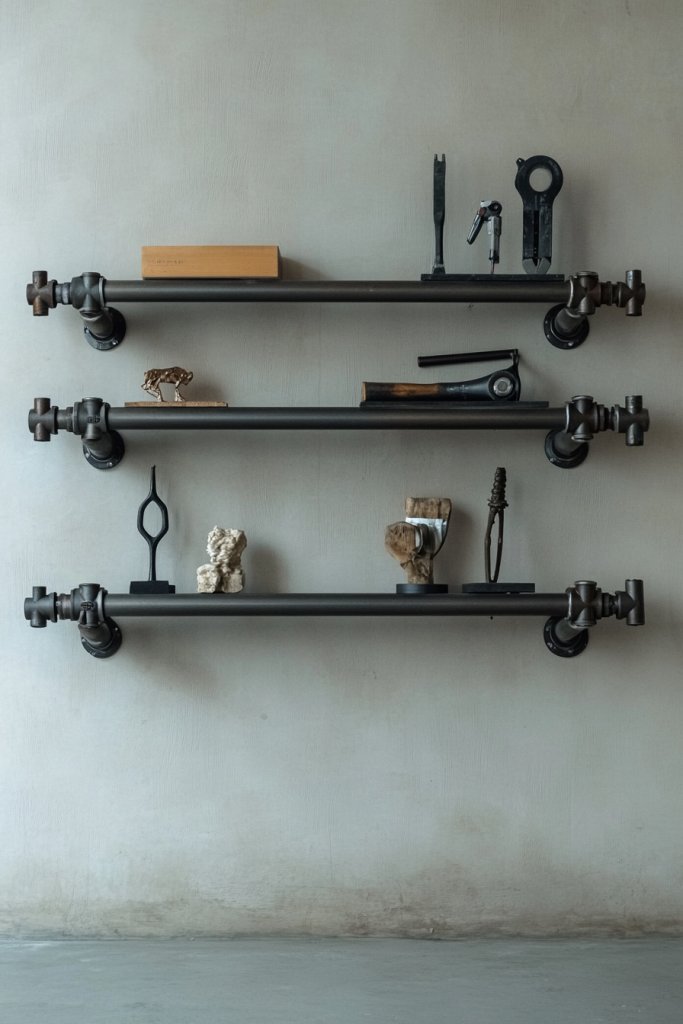 Visualize sturdy black iron pipes forming a shelf system mounted on your wall, supporting wooden planks or metal trays. Art supplies or sculptural tools sit neatly organized, ready for your next project. The pipes add an urban, raw texture that contrasts beautifully with colorful artwork or textured decor. Small accents like vintage tools or decorative brackets heighten the industrial vibe. This setup feels robust, stylish, and highly functional.