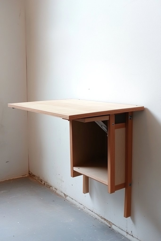 Imagine a stylish wall-mounted table that folds down to reveal a smooth work surface, with compartments or drawers hidden within the structure. When folded up, it becomes a decorative panel or art piece, blending seamlessly into your decor. Simple brackets or hinges support the table, which can be tucked away when you need more space. The design is sleek, modern, and highly functional, making your space feel open and tidy.