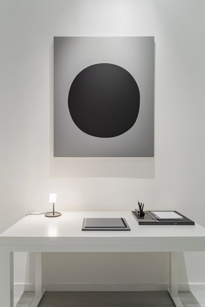 Visualize a sleek, streamlined desk with a monochrome art piece hanging above—perhaps a bold black-and-white print or a subtle abstract design. The space is free of unnecessary objects, with only essential supplies stored neatly in drawers or on wall-mounted organizers. The color palette is consistent, with neutral tones and minimal decorative accents. This aesthetic feels peaceful, organized, and inspiring—like a modern art gallery in your own home.
