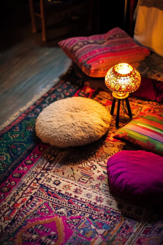 16. Artistic Corner with a Colorful Rug, Cushions, and Creative Lighting