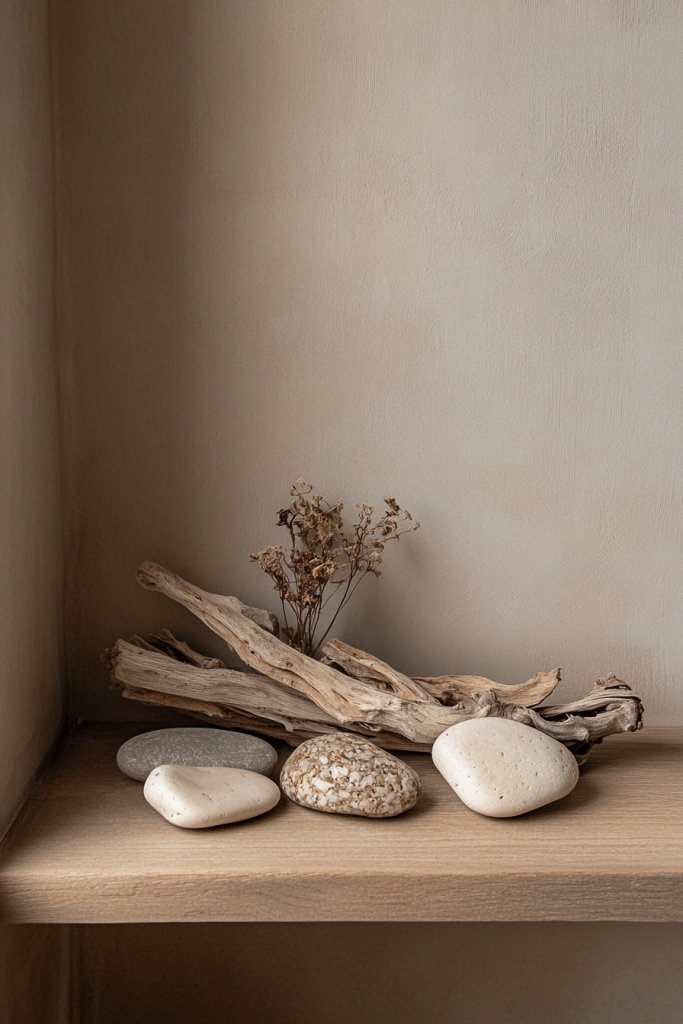 17. Nature-Inspired Art Corner with Driftwood, Stones, and Natural Elements