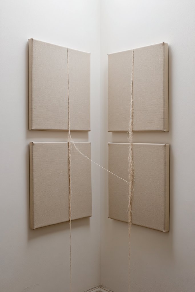 Visualize a large blank canvas mounted on your wall, serving as a backdrop for your art. In front, colorful threads or yarns are woven into intricate patterns, creating a textured tapestry that catches the light. The combination of the smooth canvas and textured thread adds visual contrast and tactile interest. Accent it with small decorative elements like fabric swatches or painted shapes. The result is a cozy, layered nook that sparks creativity.