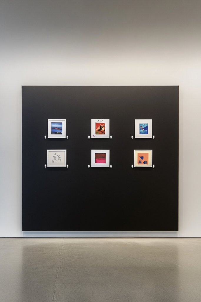 Envision a sturdy wire mesh or grid suspended from the ceiling or mounted on your wall, with colorful clips hanging from it. Your sketches, photos, or small artworks hang from these clips, ready to be swapped or rearranged. The grid’s open design creates a sense of space and allows light to flow freely. Small decorative objects or string lights can be woven around it for added texture. The overall look is sleek, functional, and urban-inspired.