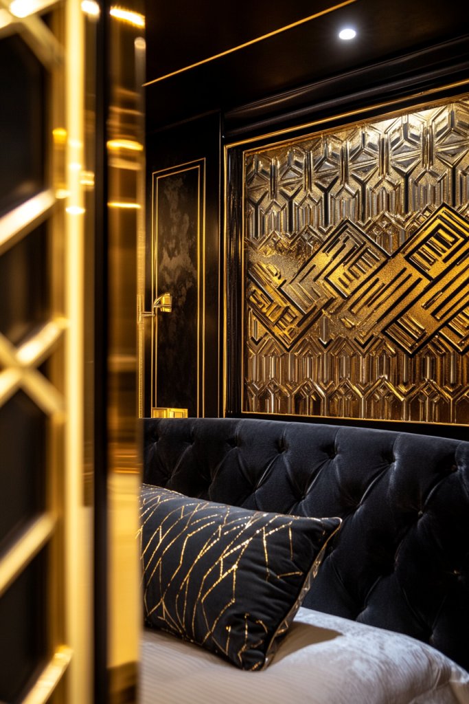 Want to add architectural interest to your bedroom without a major renovation? Art Deco-inspired wall paneling and moldings introduce texture and depth that elevate the entire space. It’s like giving your walls a stylish, sculptural makeover.
