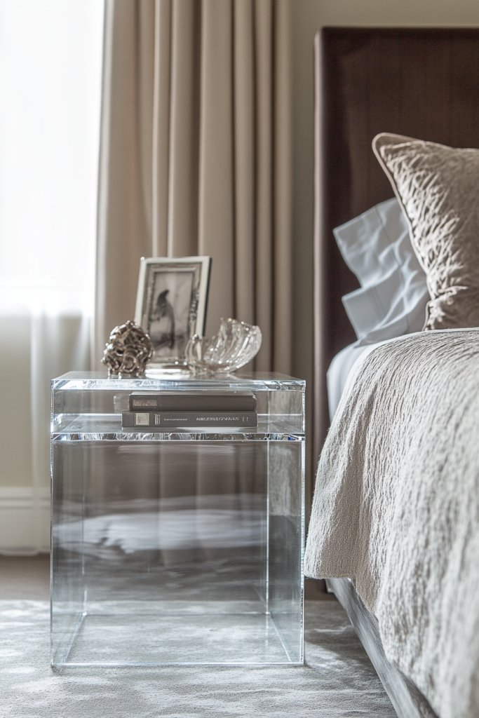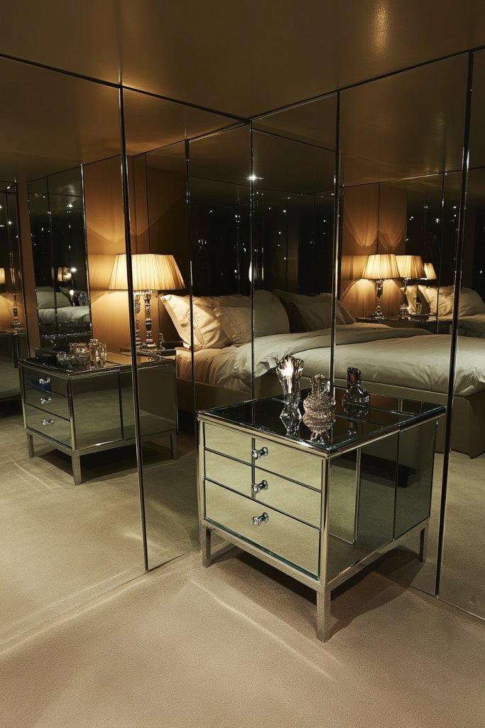 Incorporate metallic or glass accents to complement the reflective furniture and plush fabrics. Mirrored furniture with velvet upholstery elevates your bedroom into a luxurious retreat.