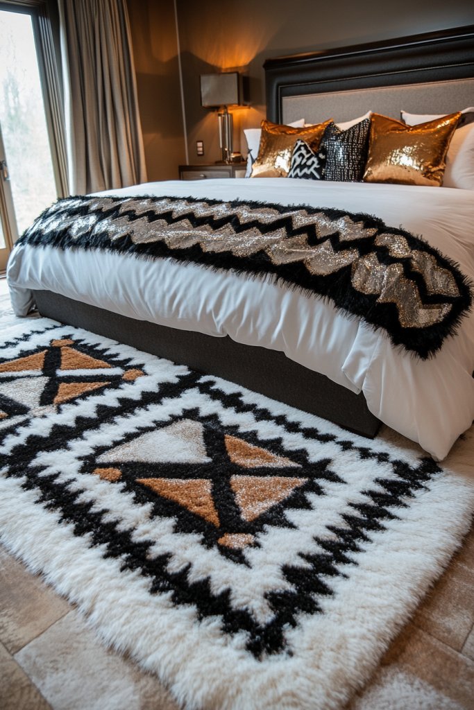 Incorporate metallic or beaded accents to complement other luxe elements in your bedroom. Faux fur rugs and textured throws are a simple upgrade that instantly boosts comfort and style.