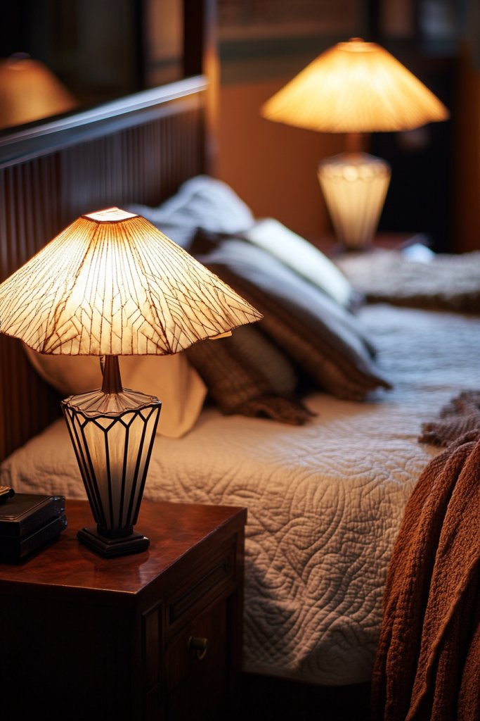 A well-lit bedroom sets the mood and highlights your decor. Layered lighting with art deco-inspired lamps creates a warm, inviting glow while adding a decorative element.