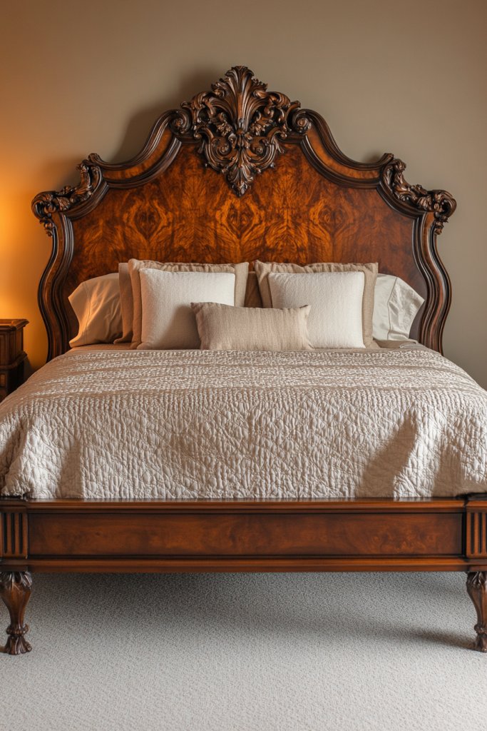 Seeking an elegant focal point without overwhelming the room? A low-profile bed frame paired with an ornate headboard combines modern simplicity with vintage charm. It anchors your space beautifully.