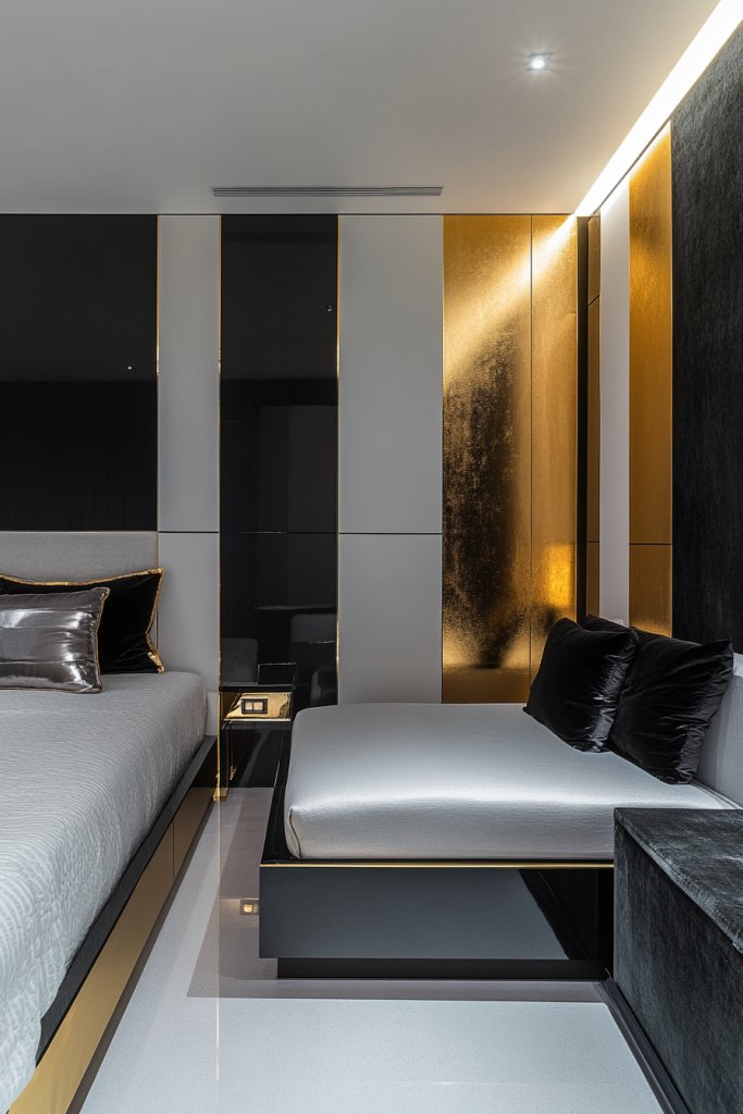 The interplay of matte and shiny surfaces creates depth, while geometric patterns reinforce the Art Deco aesthetic. Use black and white for large elements like walls and furniture, then add chrome in smaller details for balance.