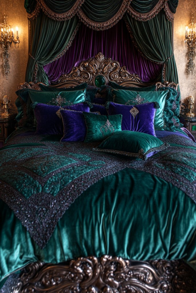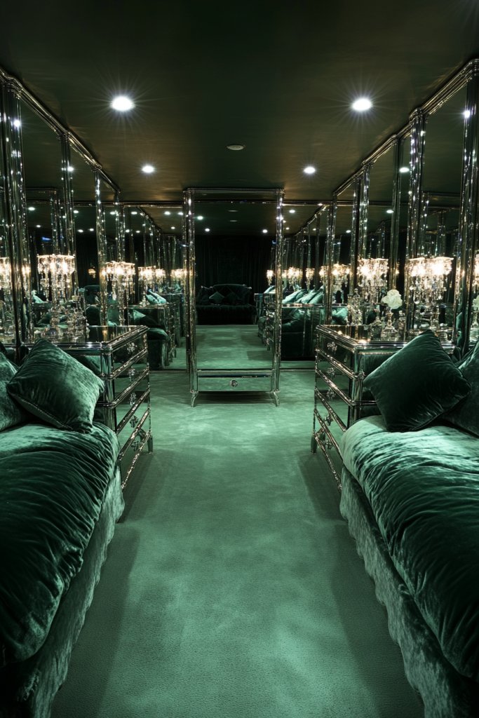 Select furniture with mirrored panels or surfaces—these can be custom-ordered or found at vintage shops. For upholstery, pick velvet in deep, saturated hues like emerald, sapphire, or ruby to add a regal touch.