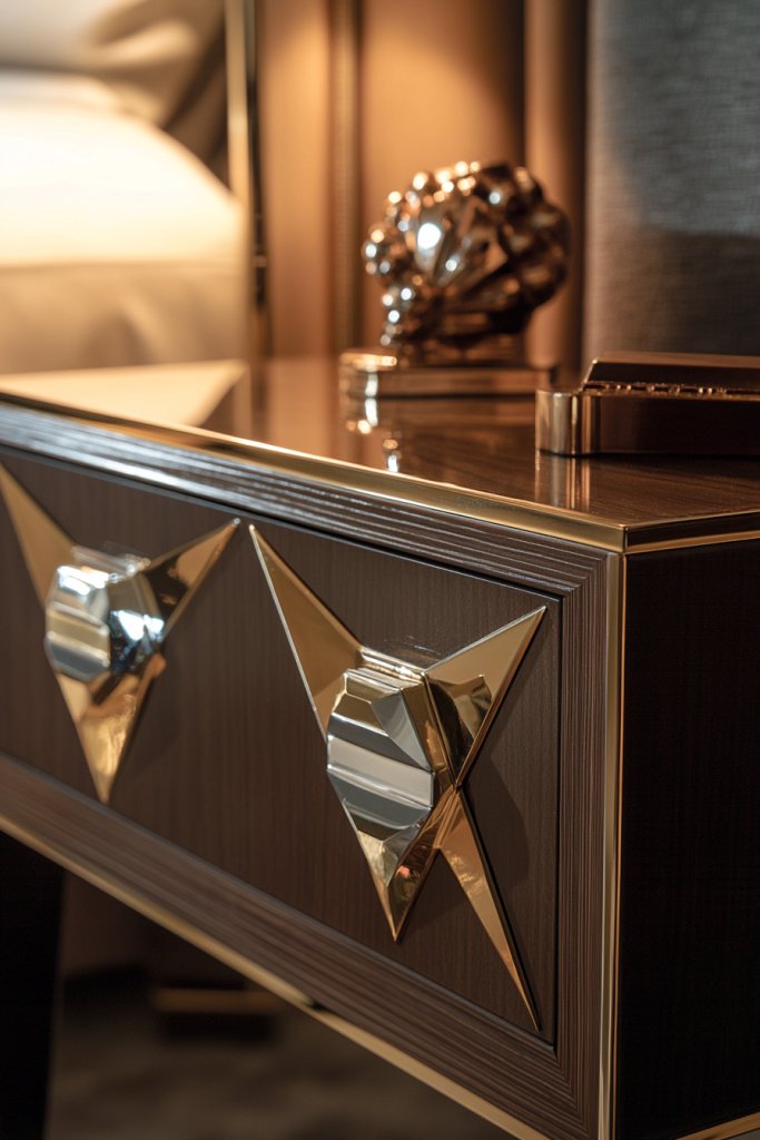 Small details can make or break a design, especially in a luxe art deco bedroom. Upgrading your furniture hardware to geometric or stepped brass and chrome pulls instantly elevates the look.