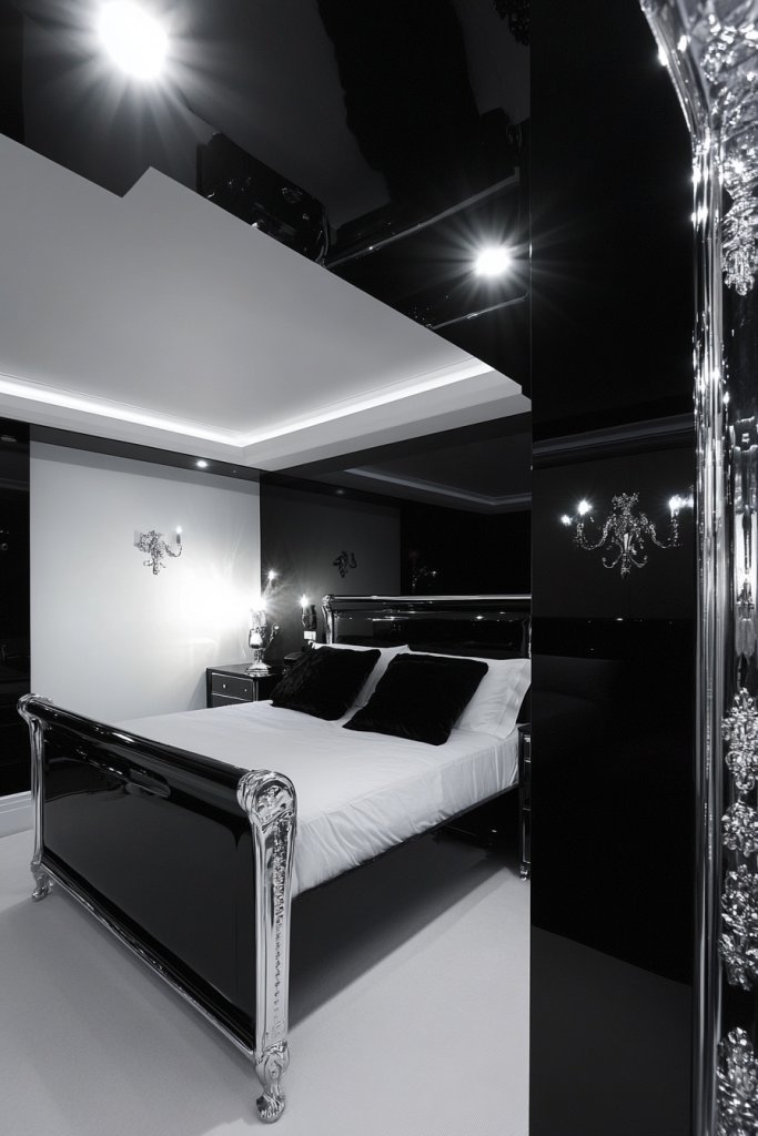 Visualize crisp white walls contrasted with bold black furniture or textiles. Chrome fixtures—handles, knobs, or decorative trims—reflect light and add a shiny, futuristic touch.