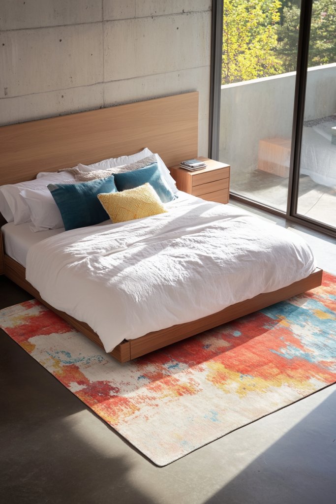 Imagine a vibrant, patterned rug with bold geometric or abstract designs under your bed or seating area. The colors tie together your bedding, furniture, and decor, creating a unified look. Textured rugs with fringe or layered carpets add tactile richness and visual depth. When layered or combined, they create visual boundaries that define different areas, like a cozy reading nook or a lounging zone.