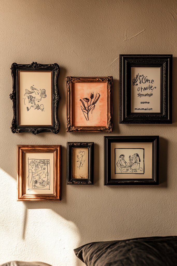 Imagine a cluster of frames in various shapes and sizes, filled with your doodles, paintings, or photographs. Use colorful or themed mats to add contrast and focus. Mix in hand-drawn quotes or calligraphy for added personality. The arrangement creates a lively, dynamic display that reflects your journey and style. When lit softly, these pieces radiate warmth and authenticity.