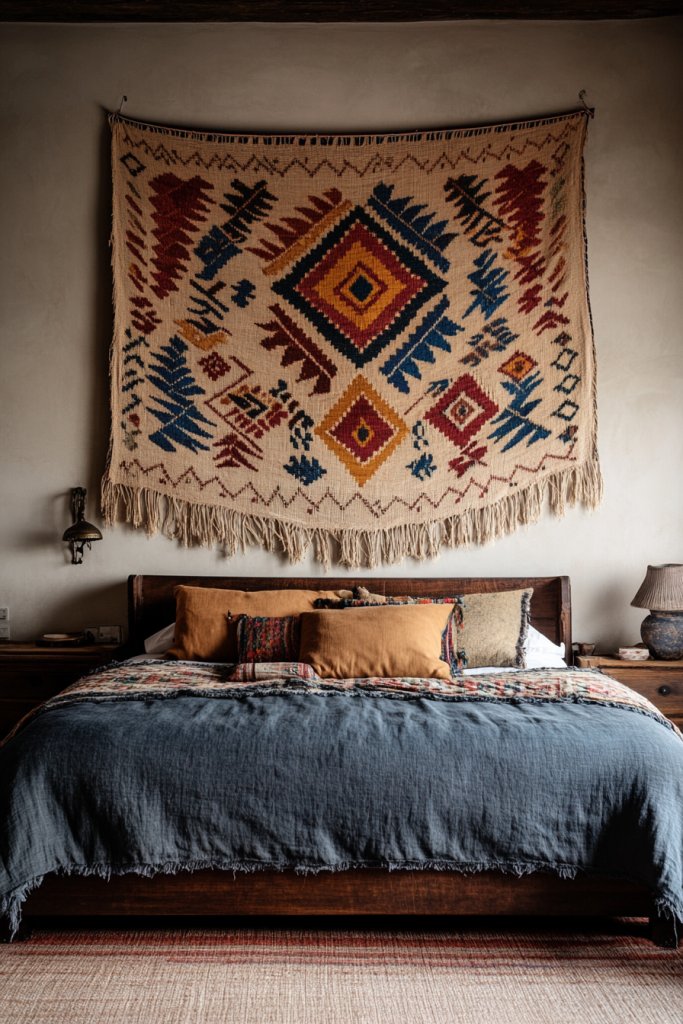 Picture a large, flowing textile piece draped across your wall, featuring vibrant patterns like geometric shapes or bohemian florals. The fabric’s texture varies from soft velvet to chunky knit, inviting touch and adding depth. Fringe or tassels hang loosely at the edges, catching light and creating gentle movement. The rich colors and layered textiles soften the room’s overall feel, making it more inviting.