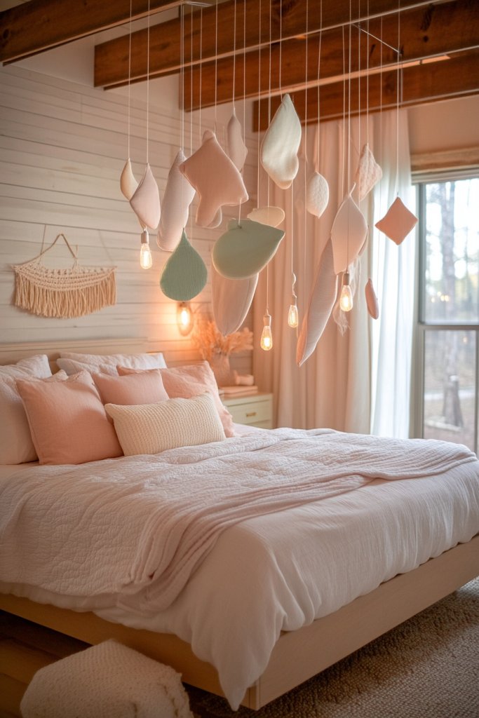 Looking for a whimsical, dynamic way to add movement and personality to your bedroom? Hanging art pieces or mobiles from the ceiling can create a sense of wonder and playfulness. It’s a creative alternative to traditional wall decor that adds a layer of visual interest from above.