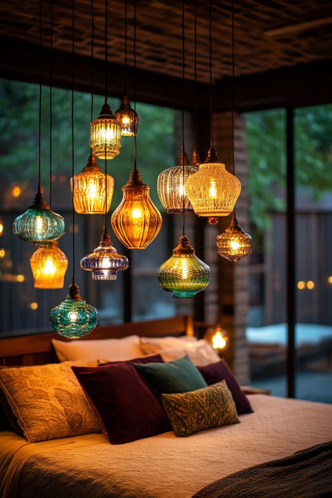 Imagine a cluster of pendant lights with colorful or sculptural shades hanging at different heights above your bed. String lights wrapped around a decorative frame or draped across the ceiling create a soft, twinkling canopy. The warm glow from unique fixtures highlights textures in your bedding or furniture, casting playful shadows. The overall effect is both functional and artful, creating a dreamy, inviting atmosphere.