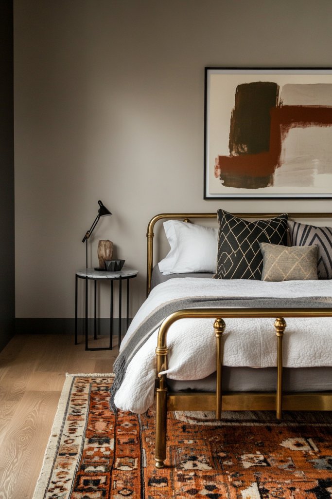 Imagine a sleek, modern bed frame paired with a vintage trunk at the foot and a mix of contemporary and antique lamps. Patchwork textiles, bold artwork, and quirky accessories blend seamlessly to create a curated, artsy vibe. The contrast between old and new adds visual intrigue, making each piece stand out while complementing the whole. Unexpected pairings, like a mid-century chair with a minimalist side table, give the room a lively, collected feel.